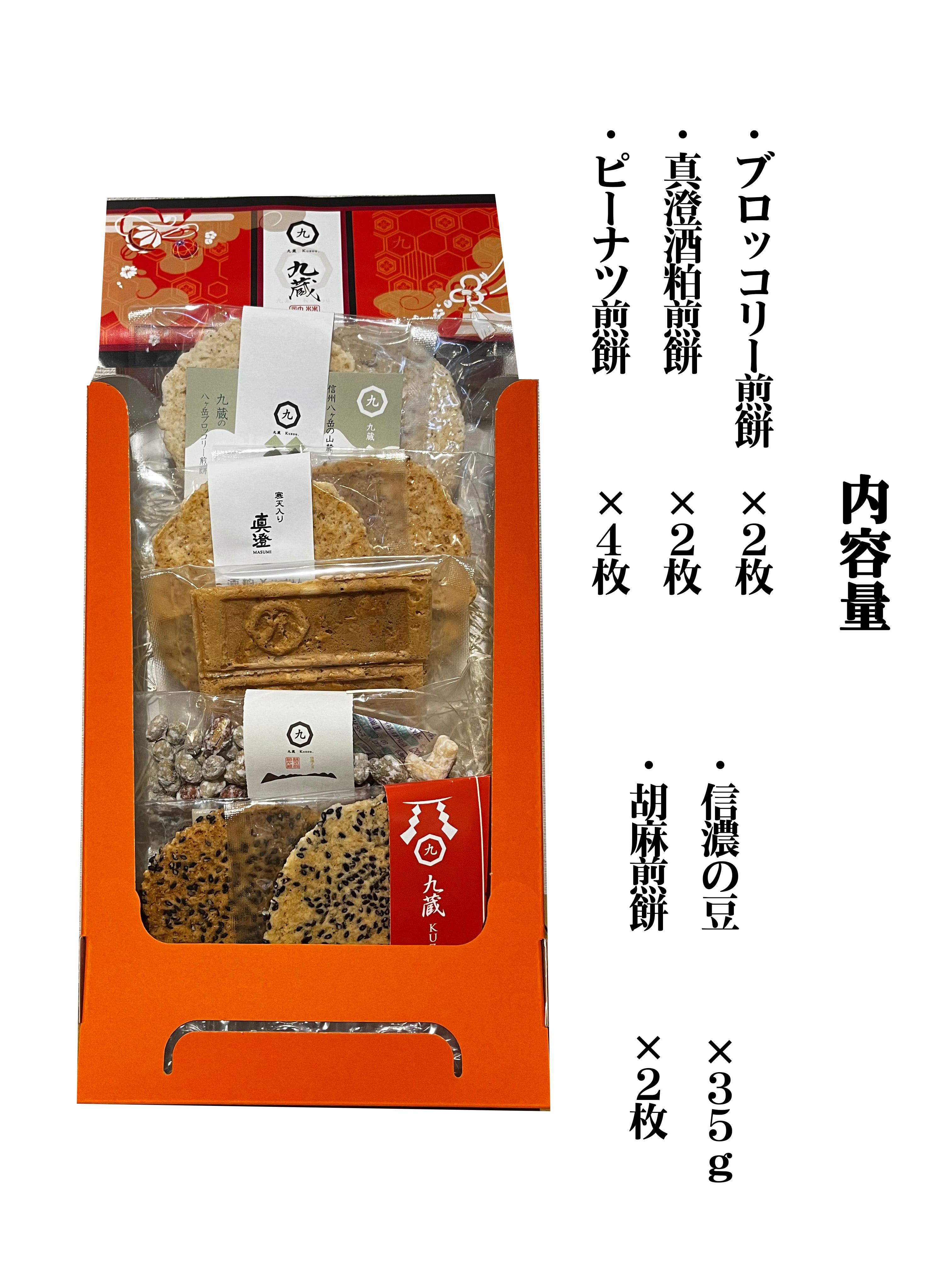 内容量:胡麻せん×4枚 えごま煎餅×2枚 酒粕煎餅×2枚 ブロッコリー煎餅×2枚